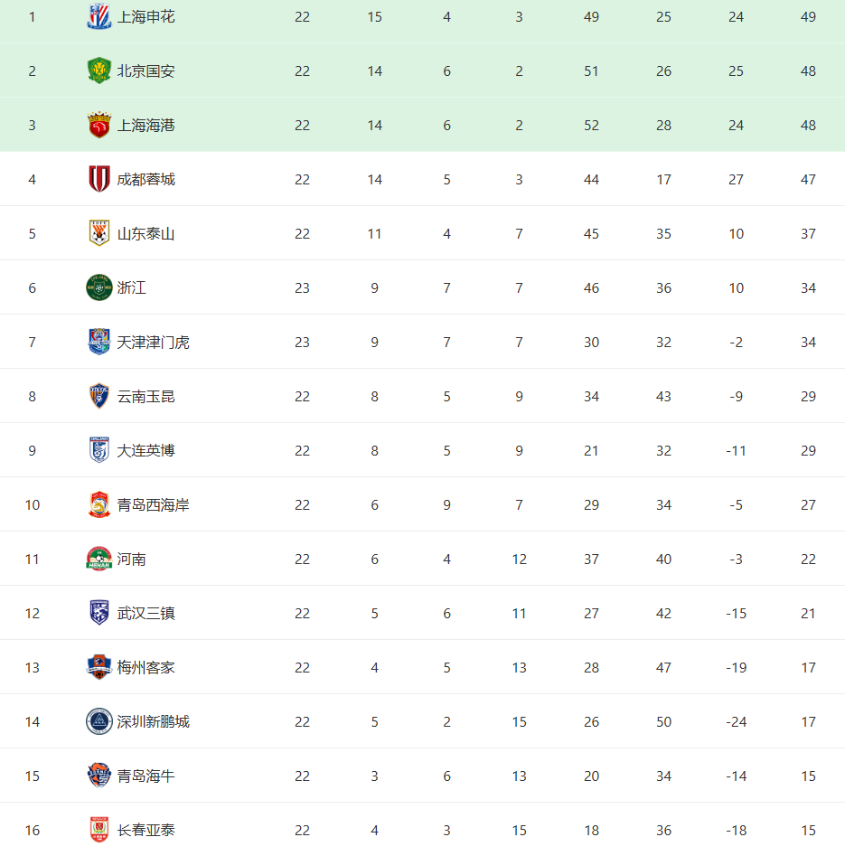争冠降级白热化!中超最新积分榜:申花领先1分,降级区4队差2分